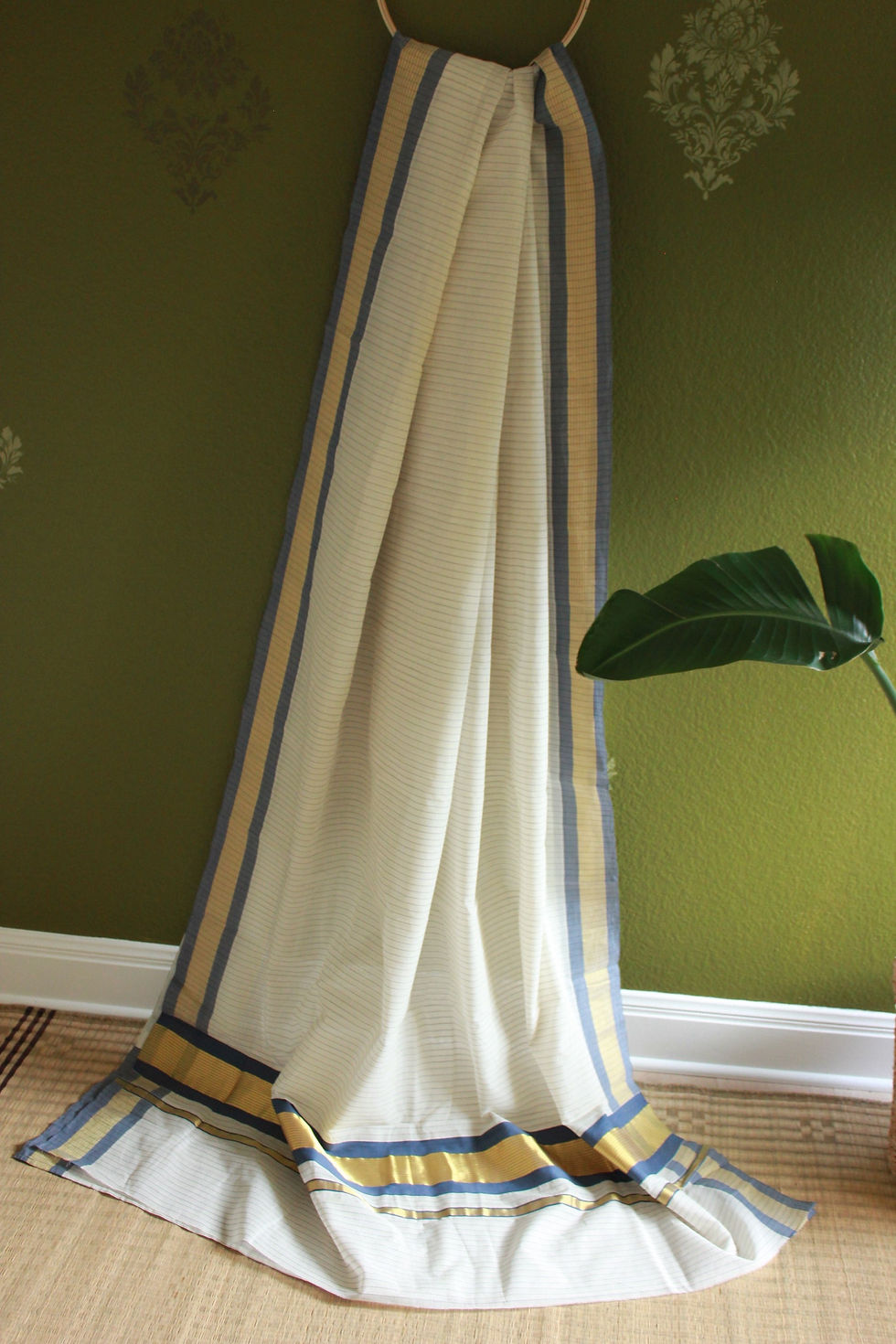 A pure handloom kasavu saree with pure zari and greyish blue selvedge